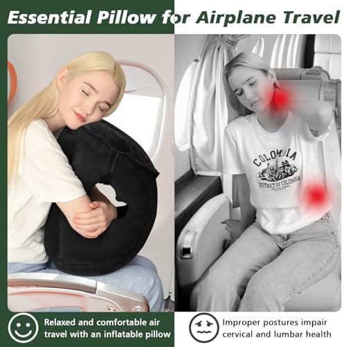 ✈Lightning-Fast Inflation: This inflatable pillow is equipped with upgraded two-in-one air valve, breath only 3-5 times to inflation until the desired firmness is achieved, it’s easy to inflate even women or elderly.The size is 13.7in*11.8in*19.8 in after blowing up, which fits better into airplane seats.Whether placed on a small table or leg, will not cause inconvenience to nearby passengers.Deflation only 2s after the transparent air valve opened The storage bag is palm size, easily securing it in your backpack or suitcase.